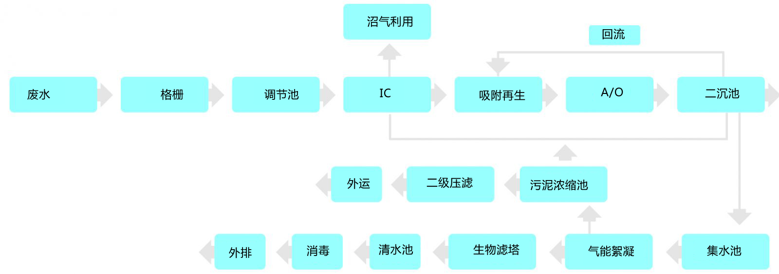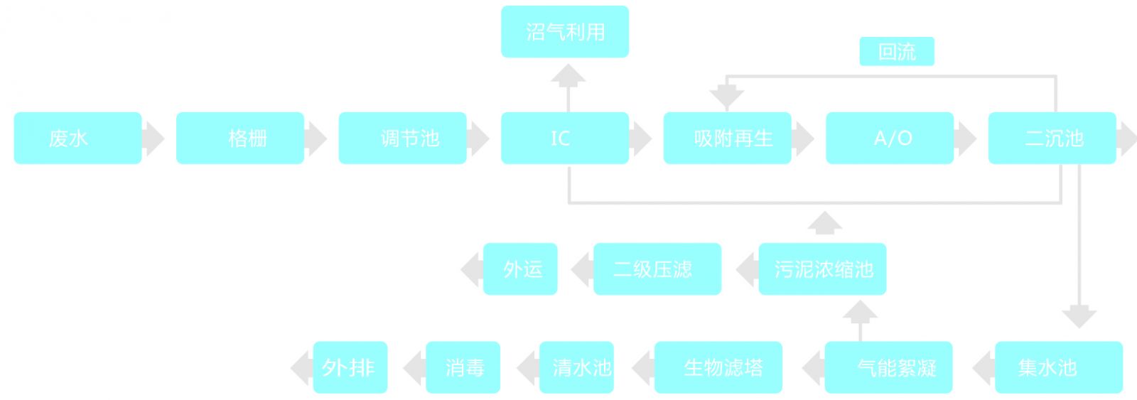 廢水經(jīng)格柵預(yù)處理,去除大的漂浮物質(zhì)后進(jìn)入調(diào)節(jié)池勻和水質(zhì)水量,調(diào)節(jié)后的污水進(jìn)入IC高效厭氧反應(yīng)器,廢水在反應(yīng)器中自下而上流動,有機(jī)污染物被高濃度的厭氧顆粒污泥吸附并降解,同時IC可以通過內(nèi)循環(huán)改善傳質(zhì)效果,并實(shí)現(xiàn)自動稀釋進(jìn)水,不僅降低了有機(jī)物負(fù)荷,還能有效保證進(jìn)水濃度的穩(wěn)定性,極大地提高對COD等有機(jī)污染物的處理效率。出水進(jìn)入A/O反應(yīng)池,通過缺氧/好氧工段高效去除COD并實(shí)現(xiàn)脫氮功能。處理后的出水經(jīng)二沉池進(jìn)行固液分離后,進(jìn)入氣能絮凝系統(tǒng)進(jìn)一步去除水中殘留的細(xì)小懸浮物。再由具備生物代謝與吸附過濾雙重功能的生物濾塔處理,出水消毒后即可達(dá)標(biāo)外排。