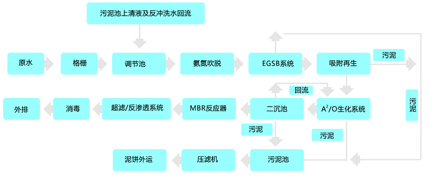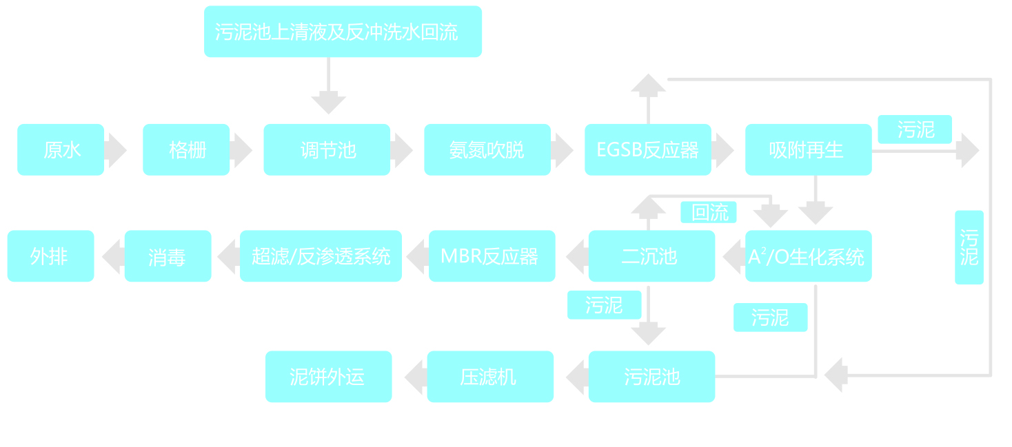經(jīng)過格柵的垃圾滲濾液與其它地表污水混合后,進(jìn)調(diào)節(jié)池進(jìn)行水質(zhì)水量的均和,再通過吹脫塔去除所含的氨氮污染物質(zhì),調(diào)pH值后進(jìn)入EGSB反應(yīng)器,利用反應(yīng)器內(nèi)形成的厭氧顆粒污泥高效降低COD,出水經(jīng)由A2/O進(jìn)一步降解有機(jī)污染物,并高效去除污水中氮、磷,二沉池出水通過超濾/反滲透系統(tǒng)對重金屬離子進(jìn)行精細(xì)處理,出水經(jīng)消毒達(dá)標(biāo)后外排。
