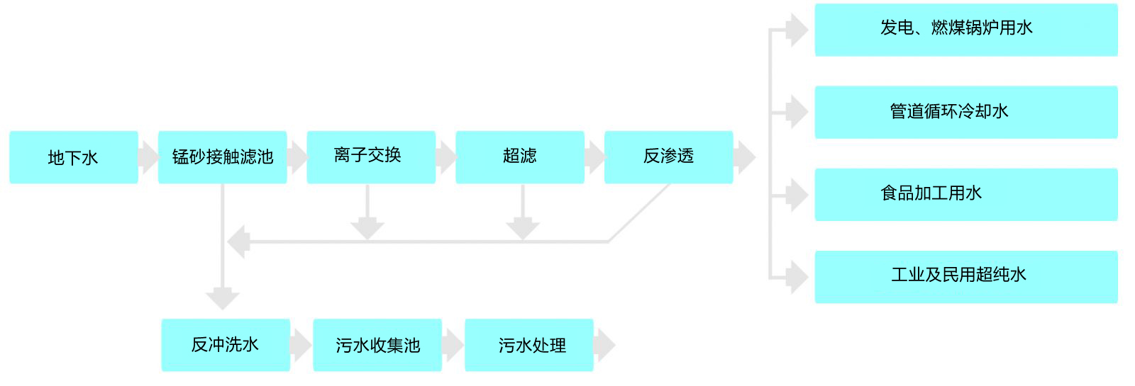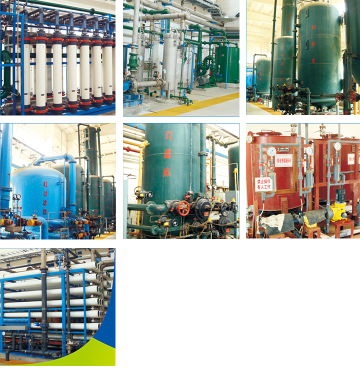首先采用射流曝氣器讓地下水與空氣中的氧充分接觸,讓Fe2+、Mn2+氧化生成Fe3+、Mn4+,通過吹脫的原理,降低進(jìn)入曝氣器中空氣的CO2含量,提高pH,并通過除鐵錳過濾器里錳砂濾料的催化氧化作用,在濾層表面加速形成大量的金屬氫氧化物,可將其高效吸附截留在濾層孔隙中得以去除。當(dāng)濾層達(dá)到吸附飽和后采用氣水聯(lián)合沖洗,使濾料得以再生。濾后水進(jìn)入離子交換系統(tǒng),利用陽性樹脂交換基團(tuán)里的鈉離子同水中的鈣、鎂離子進(jìn)行交換,以此降低水的硬度。樹脂飽和后可通過鹽水再生循環(huán)使用。出水經(jīng)超濾和反滲透處理后徹底濾除水中的細(xì)菌、金屬離子、大分子有機物等有害物質(zhì),可用于燃煤鍋爐發(fā)電、工業(yè)管道循環(huán)冷卻、工業(yè)及民用超純水、食品加工及其它特殊行業(yè)用水。