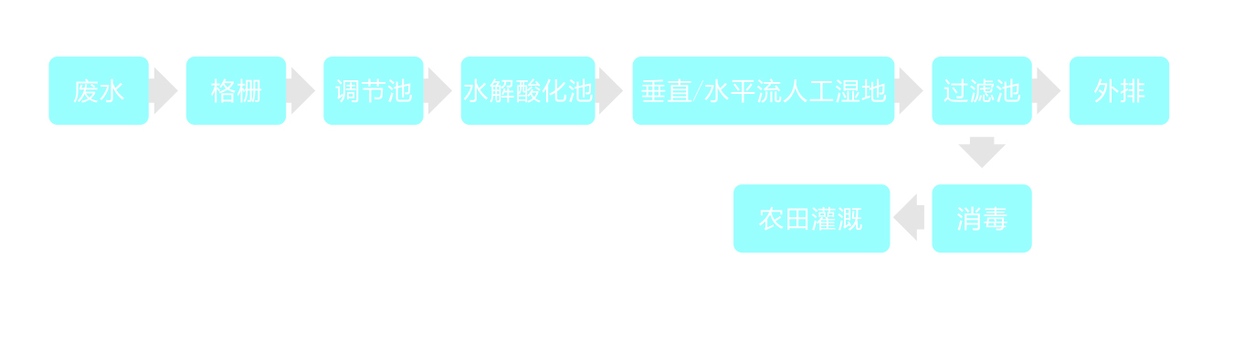 廢水經(jīng)格柵和調(diào)節(jié)池預(yù)處理后,進(jìn)入水解酸化池,污水中有機(jī)物通過附著在池內(nèi)填料中微生物膜的分解得到初步降解,固體懸浮物被沉降去除,有機(jī)物由大分子被分解成小分子而提高其可生化性。出水通過配水管網(wǎng)進(jìn)入垂直/水平流人工濕地系統(tǒng)的各個(gè)單元,利用土壤、人工介質(zhì)、植物、微生物的物理、化學(xué)、生物三重協(xié)同作用,其機(jī)理包括吸附、滯留、過濾、氧化還原、沉淀、微生物分解、轉(zhuǎn)化、各類植物對(duì)污水中營養(yǎng)源的吸收等,以實(shí)現(xiàn)去除污水中COD、BOD、氮磷等各種污染物的目標(biāo),人工濕地系統(tǒng)出水由過渡池外排或消毒后用于景觀澆灑、沖洗道路、灌溉農(nóng)田等。