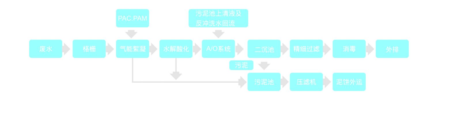 生產(chǎn)廢水經(jīng)過(guò)格柵排至氣能絮凝系統(tǒng),加入混凝藥劑,去除廢水中的色度和懸浮物后進(jìn)入水解酸化池,將廢水中溶解性大分子有機(jī)物轉(zhuǎn)化為結(jié)構(gòu)簡(jiǎn)單的小分子物質(zhì),提高廢水可生化性,出水接著進(jìn)入A/O系統(tǒng),通過(guò)缺氧/好氧工段高效去除COD并實(shí)現(xiàn)脫硝,經(jīng)二沉池進(jìn)行固液分離,上清液經(jīng)精細(xì)過(guò)濾、消毒后達(dá)標(biāo)外排。