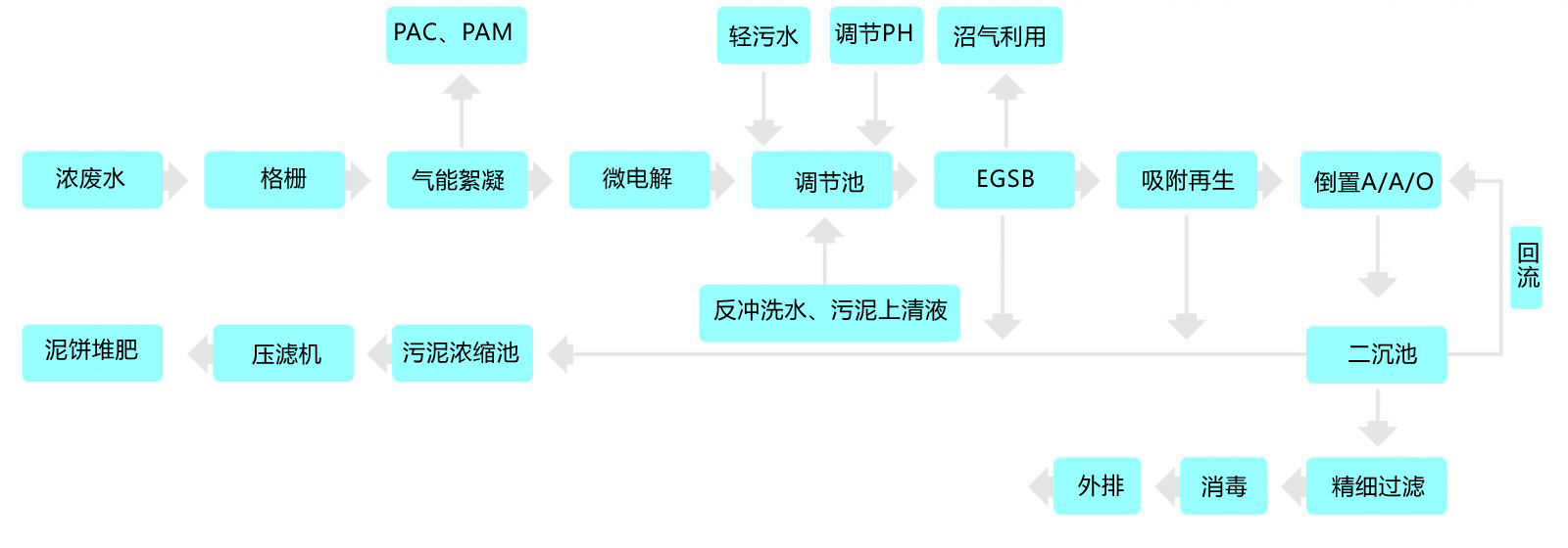 首先對濃污進行預處理,原水進入氣能絮凝系統(tǒng)去除懸浮物,進入鐵碳微電解系統(tǒng),通過電絮凝原理去除部分磷及COD,處理后的出水和輕污在綜合調節(jié)池內調勻后進入EGSB反應器進行厭氧處理,在高效降解COD的同時利用原水中豐富的有機質產生沼氣,用于廠區(qū)內的鍋爐發(fā)熱,實現循環(huán)利用。
